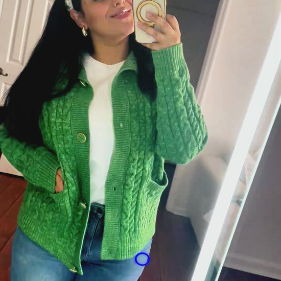 Whether you're enjoying a cozy evening in or stepping out for a relaxed weekend, this green cable knit cardigan promises warmth, style, and comfort.