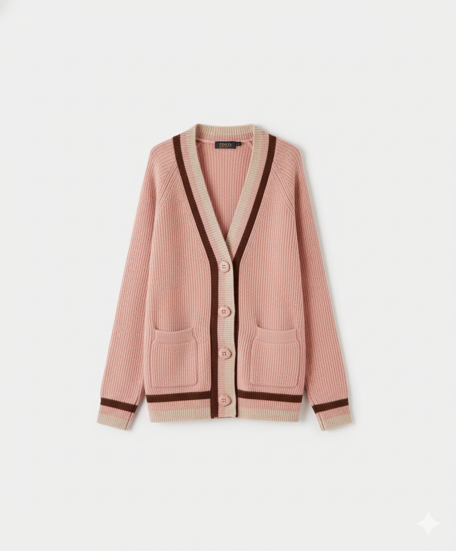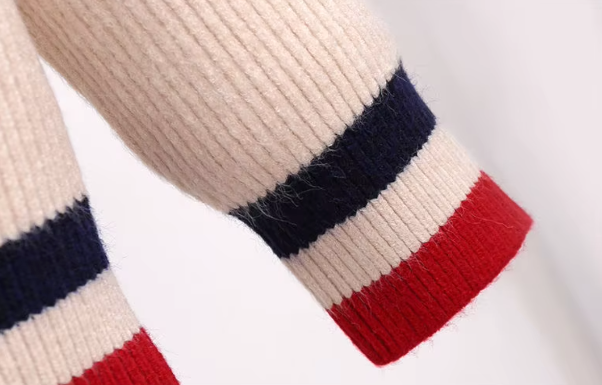 Iconic Striped Design: Featuring bold red and navy stripes along the V-neckline, front placket, and cuffs, this cardigan offers a classic aesthetic that never goes out of style.